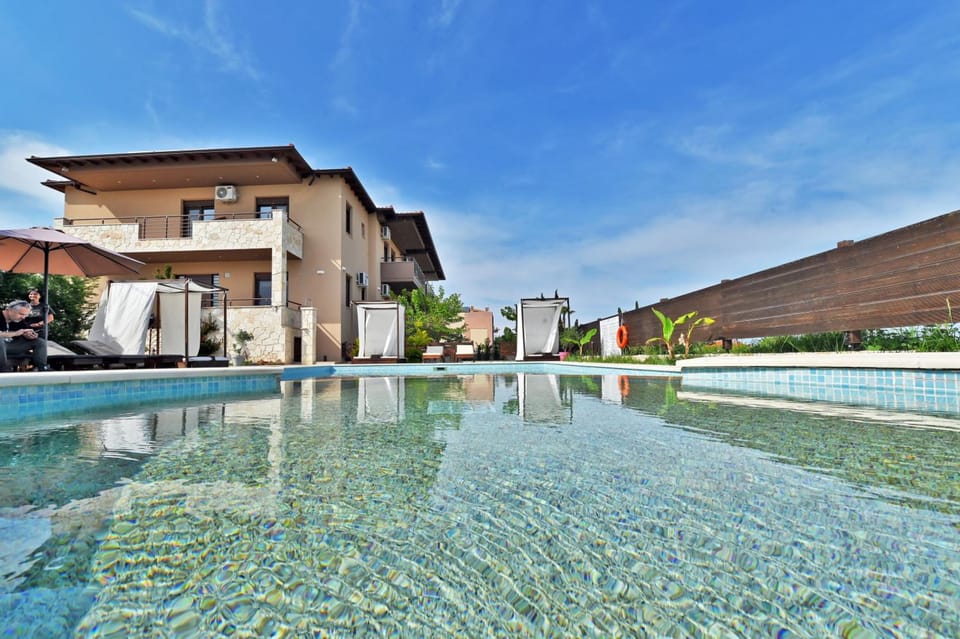 Yes, a swimming pool is available for use at Sinodinos Deluxe Apartments. Enjoy the water!