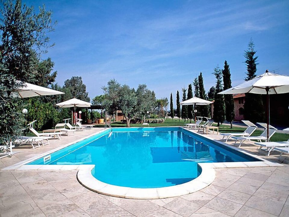 Bordering the famous nature reserve Parco dell'Uccellina (reachable by bike path directly from the residence), the structure preserves the beauty of simplicity, enriched with modern living comfort. Beautiful resort. 13 apartments in the residence. 3 km from the centre of Grosseto, 7 km from the centre of Principina a Mare, in a secluded, quiet, sunny position, 7 km from the sea, 7 km from the beach, in the countryside. For shared use: garden, swimming pool (seasonal availability: 15.May. - 10.Oct.). Outdoor shower, tennis (1 x hard court), floodlit (extra), table tennis, garden furniture, barbecue, children's playground. In the house: reception, restaurant, internet access, washing machine (for shared use, extra), bicycle rental. Linen change weekly. Breakfast and half board possible. Parking on the premises. Shop 1 km, supermarket 1 km, shopping centre 1 km, sandy beach "Principina a Mare" 7 km. Riding stable 2 km, cycle lane 100 m. Nearby attractions: Castiglione della Pescaia 23 km, Marina di Grosseto 12 km, Talamone 25 km. Hiking paths: Parco dell'Uccellina 15 km. Please note: the photograph shows a typical example. Please note that the restaurant is located at 1500 meters from the house (road crossing). Concrete tennis court (1500m from the house) open every day from 08.00 to 20.00, extra (€ 20.00 / hour) by reservation, possibility to rent equipment and private individual and group lessons with specialized professional coaches. Equipped beach with parking and swimming pool approx. 7 km away (extra, subject to availability, info and booking at the reception). "Le Capanne I", 2-room apartment 30 m2. Beautiful furnishings: living room with 1 double sofabed and satellite TV. 1 room with 2 beds. Kitchenette (4 hot plates, kettle, microwave, electric coffee machine). Shower/bidet/WC. Air-conditioning. Terrace roofed. Sitting area. Facilities: Internet (WiFi, free). Maximum 1 pet/ dog allowed. The apartment could be located on the ground or first floor. Some apartments with garden. WIFI available inside and outside the apartments. IT053011B498EUOQC9