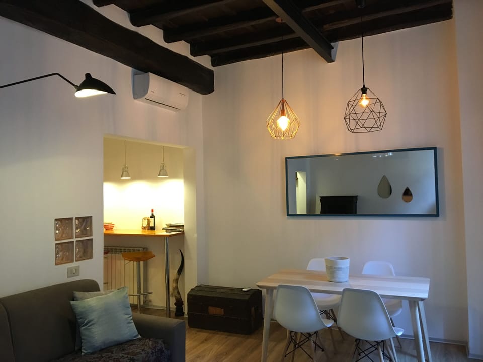 Newly renovated apartment in a historic building in the heart of Trastevere, consisting of large living room with sofa bed, kitchen with dishwasher and microwave, bathroom with shower and washing machine, double bedroom with open wardrobe and desk. Present Wifi, TV and two air conditioners.