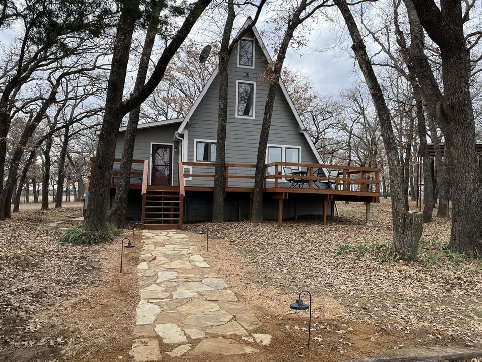 Located at the end of a private road, our seven acres of woods is a perfect location for relaxing or exploring the outdoors around Lake Texoma. The A-frame design is surrounded by large oak trees that shade the decks in the warmer months, and lots of windows to look out on the woods.