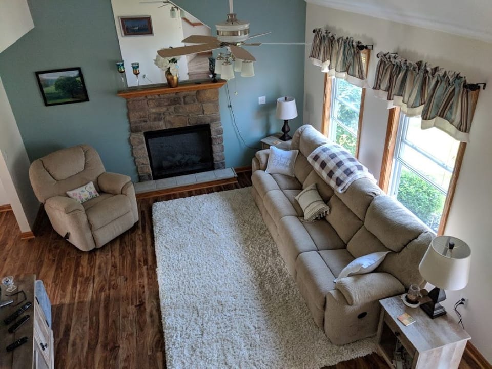 • vaulted ceiling and fireplace in living room