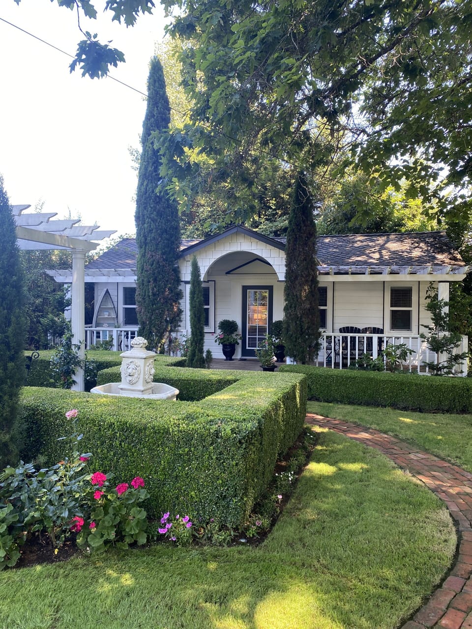 View is looking out into large enclosed gardens, pergola with gorgeous fountain. This is a guest cottage set on impeccable manicured grounds of a historic manor house! A 5 minute car ride to downtown Kirkland and 20 minutes to downtown Seattle. Every amenity within minutes of this beautiful cottage with park-like surroundings. The cottage sits on one acre of enclosed gardens where right outside you have your own patio with pergola and fountain!