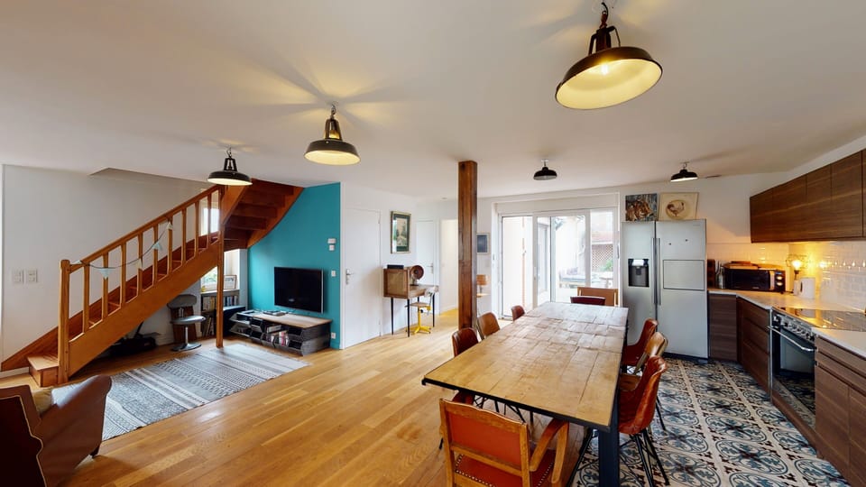 Bauloise house located near the market (1 min), avenue Charles de Gaulle (1 min) and the beach (5 min). Ground floor: living room, large fitted kitchen open to the dining room, 1 bedroom, bathroom with bath and walk-in shower, toilet. On the first 3 bedrooms (including a dormitory with 5 beds), a bathroom. TV, vintage game consoles and SONOS sound system throughout the house. small garden with BBQ, deckchair and hammock.