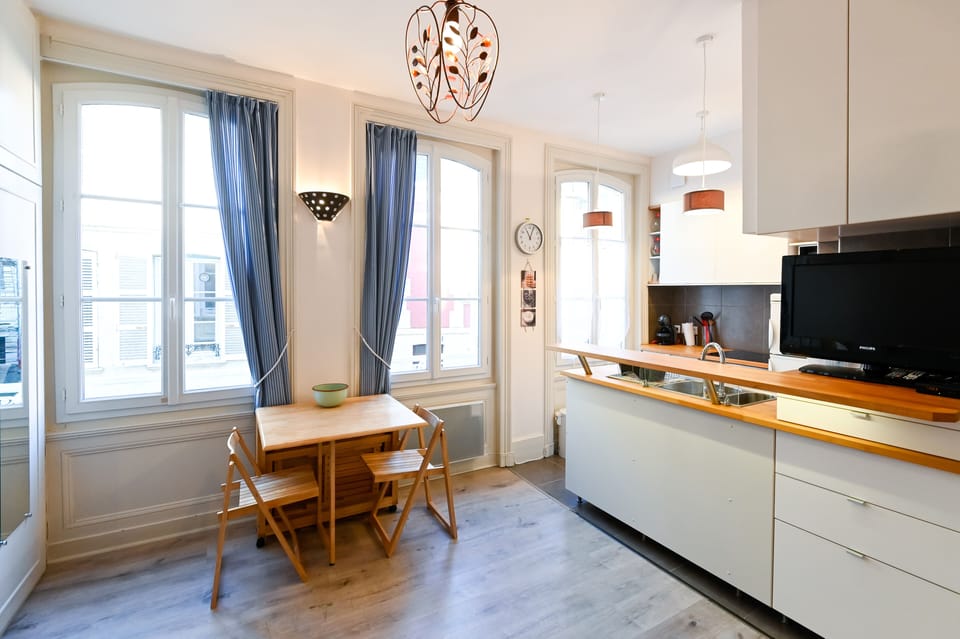 - A living room, very bright (3 windows to the west) with sofa bed (140 x 190) new, flat screen TV, board games, open kitchen (2 coffee machines (including a Dolce Gusto), microwave oven, toaster, etc ...