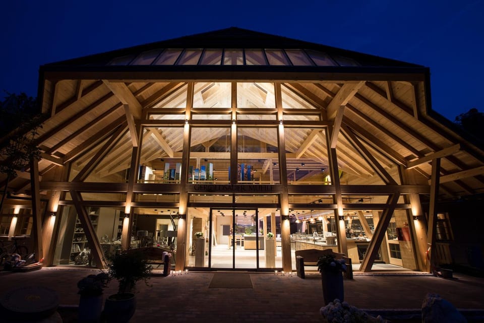 It's a very cosy place to stay: modern wood chalet vibes, high ceilings and spacious bedroom and bathroom, comfortable bed, quiet rooms, with a pleasant view overlooking the fields with horses at a distance. The attached restaurant is a must to try regional dishes and drinks, with excellent service and good atmosphere - seems like a local's favourite spot and family friendly. There is a large outdoor area by the stream and mill with a terrace and playground for warmer times of year. Seems like a great spot to be in all seasons, a little outside the centre and excellent access to hiking trails. Breakfast offers a lot of variety. There is a supermarket and a bakery in the same building and plenty of tourist information.