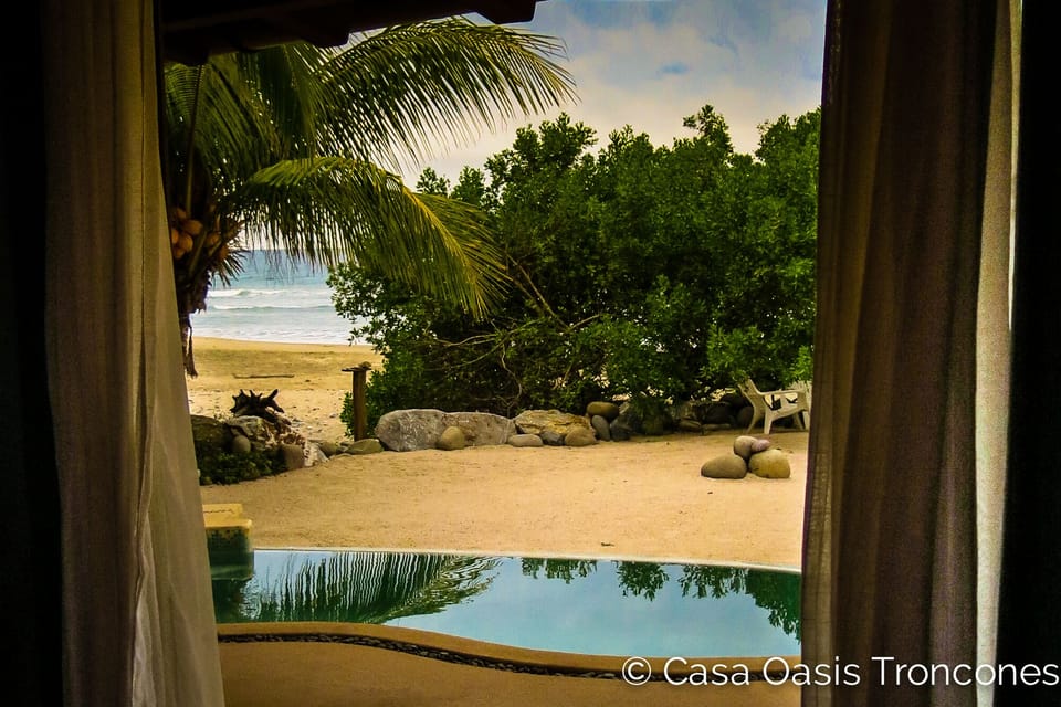 The Casa Oasis Troncones downstairs beachfront flat boasts a spacious outdoor living area with dining table and large comfy L-shaped couch — with great views of the ocean and the beach heading South. Keep an eye on the swell, whale watch, enjoy the sunset, and/or frolic in the pool — all from your own outdoor living room. The space has two high-speed ceiling fans for maximum comfort (in case you need them—there’s always an ocean breeze). This is true beach living.
