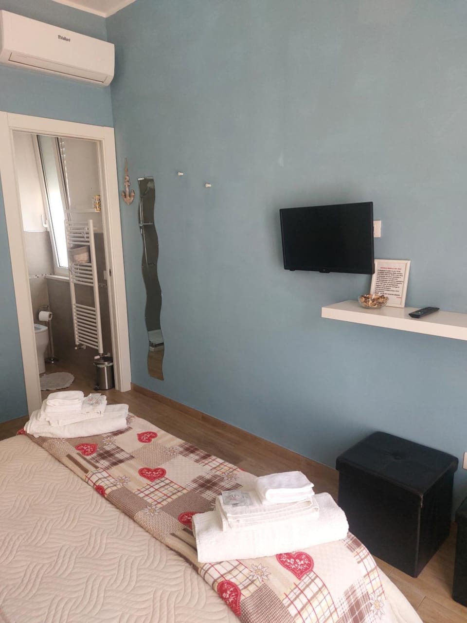 La camera è un po' piccola, ma per qualche giorno di mare è più che sufficiente. Consiglio ad Alessandra delle lenzuola più grandi, perché negli angoli scappano via :)