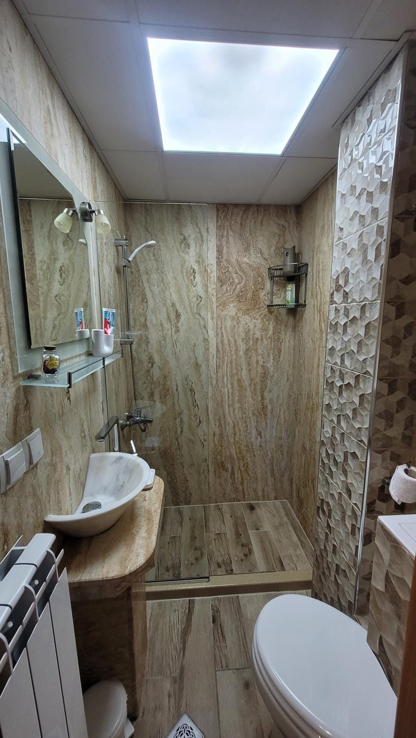- lipsa usii complete la cabina de dus, daca esti mai “corpolent” si nu esti atent dai apa pe jos. Cabina are un mic perete de sticla dar nu suficient pentru a nu uda pe jos, dar per total nu este o problema acest lucru
