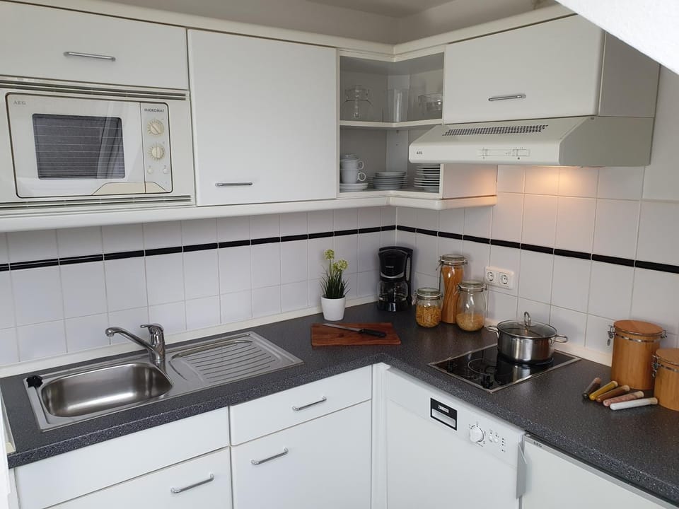 Die Wohnung war insgesamt sauber, allerdings gab es einen unschönen Fleck auf einer Zudecke, war nur zufällig zu sehen, da der Bettbezug es verdeckte. Kaffee- und Teezubehör wurde als gegeben genannt. Es gab zwar Wasserkocher und Kaffeemaschine, allerdings keinen Kaffee, keine Kaffeefilter. Außer Salzstreuer und einer Flasche Mineralwasser gab es nichts. Pflegeprodukte beschränkten sich auf Seife und Shampoo.