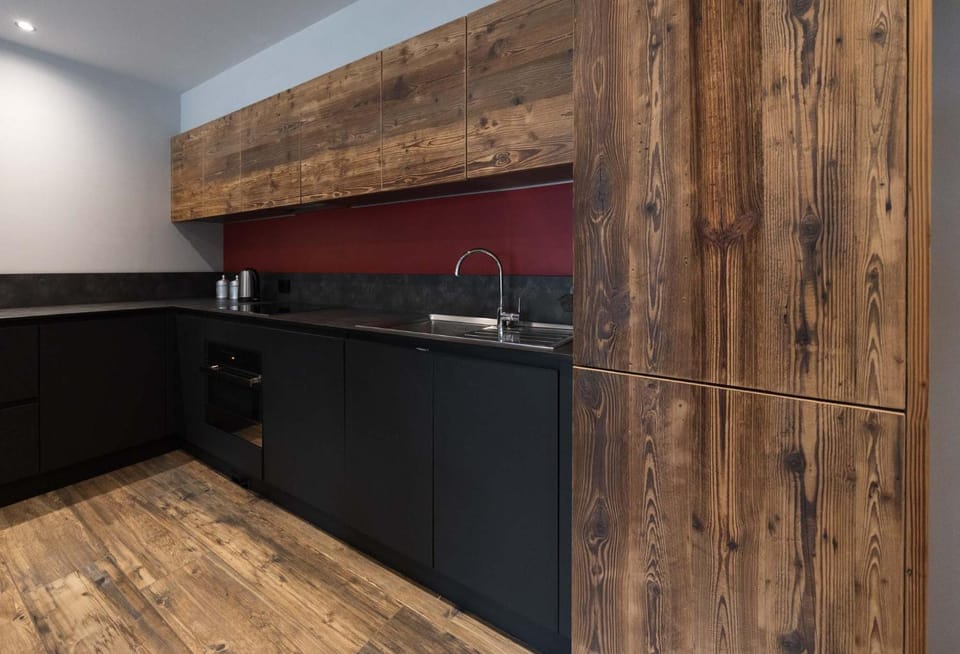 The wooden door panels of the kitchen have the vein running through them, making it look like it ..."