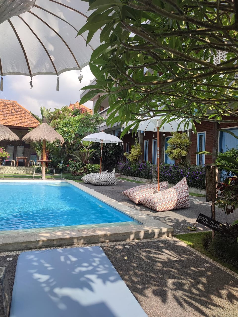 Ik had dit hotel gekozen omdat het stil zou zijn, dat is helaas absoluut niet zo, en daarom wil ik toch de andere reviews wat nuanceren. Voor je nachtrust kom je hier niet. De schuifdeuren maken veel lawaai en sluiten ook niet volledig (je kijkt letterlijk naar buiten). Je hoort alles wat er in het hotel gebeurt in je kamer. Daarnaast begint het personeel tussen 5:30 en 7:00 in de ochtend met vegen en met elkaar praten en lachen. Bij regen worden daarbij ook alle stoelen en meubels heen en weer gesleept, om de glibberige veranda droog te maken. Ook hoor je alsnog de motoren op straat racen. Het hotel zou veel baat kunnen hebben bij normale deuren en dubbel glas.