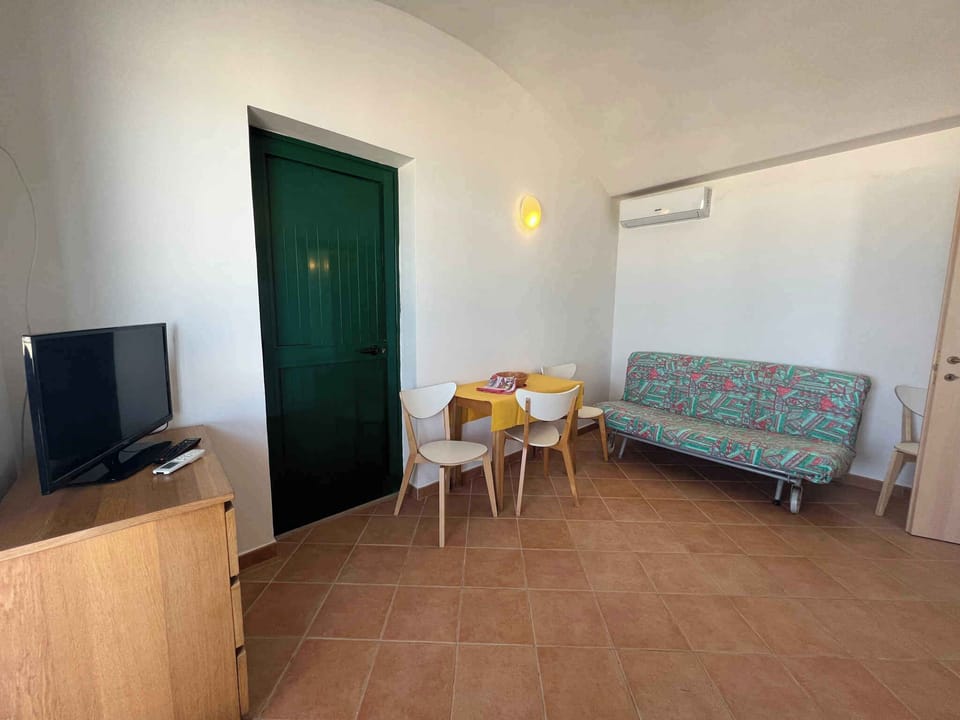The entrance to your bungalow leads over the balcony directly into the kitchen-diner. Bedroom with 1 double bed. Living/bedroom with 2 additional beds on double sofa bed, sitting area, TV and access to the balcony. Kitchenette in the living & bedroom with gas stove (2 flames), fridge (icebox) and Pentole, piatti e pose. Bathroom with shower, 1 washbasin, WC and bidet. with (garden furniture, parasol).
