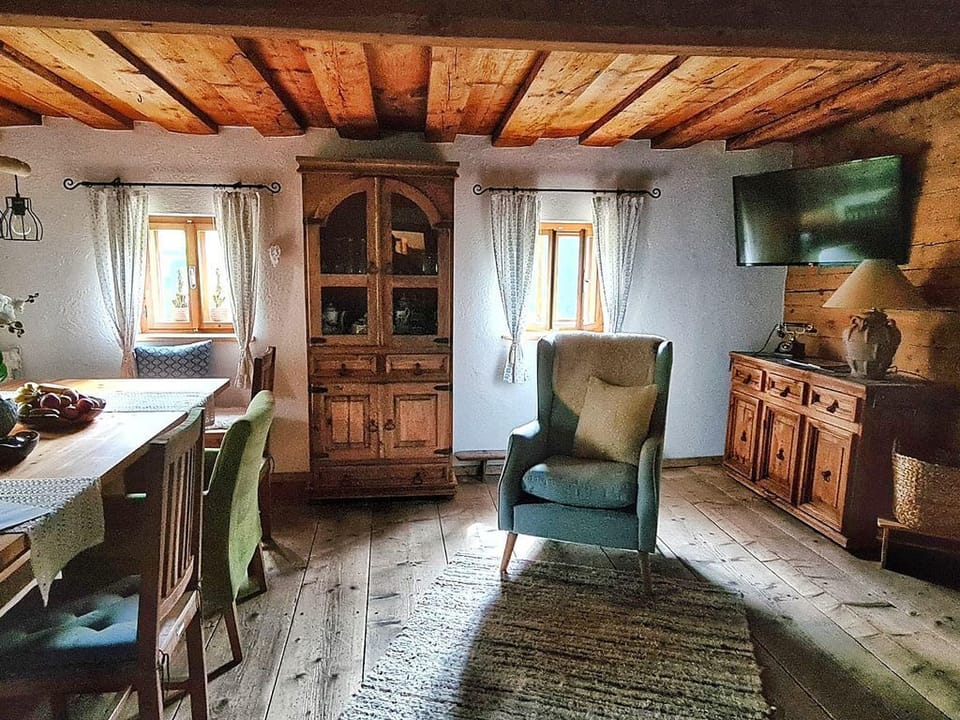Our "old house" has two floors. On the ground floor is the fully equipped kitchen with a wood stove, a cozy room with a tiled stove, sofa and flat-screen TV. 1 family room (2 floors) with its own bathroom with shower / toilet. On the second floor there are the other two double rooms with double beds made of old wood, a bathroom with shower / toilet and a generously designed hall with reading corner, sofa and flat-screen TV