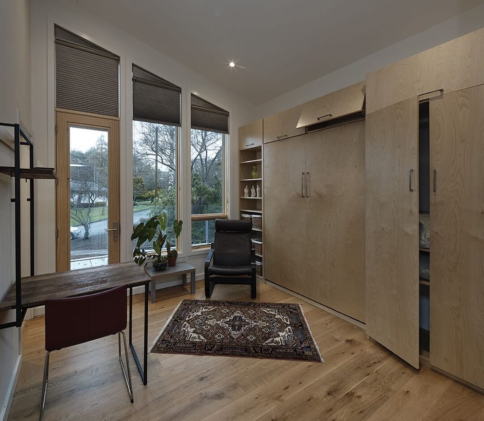 This new, high ceilinged, super bright and gorgeous micro-suite is perfect for the single traveller on a working trip or on vacation. The queen murphy bed disappears during the day to give a spacious office/living area. The three-piece bathroom has a step in shower. The large, private deck looks out over the garden and is a lovely place to enjoy morning coffee or an afternoon drink and a good book. The location is spectacular for neighbourhood walking to Gonzales Beach ( 400 metres/7 minute walk) and other locations, or taking a bus to downtown or Uvic and Camosun College ( two minute walk to bus stop and about 23 minutes to Uvic, Jubilee Hospital is about 10 minte on bus plus a 8 minute walk).Minimum booking is 89 days and includes access to a weekly laundry day and a once a month clean. Cleaning is expected by tenant in between and supplies are provided. Fairfield Plaza is a 3-minute drive or 12 minute walk and there you'll find a large Thrifty Foods ( with in-store seafood counter, butcher, deli, fruit and vegetables and bakery), BC Liquor Store, an Italian Bakery, Ross Bay Pub, Heart Pharmacy, A Thai Restaurant, Sushi Field Japanese Restaurant, Home Hardware, a Cannabis Store and more. One can walk into downtown in about 50 minutes or along Dallas Road waterfront to popular Cook Street Village shops, bars and restaurants in about 35 minutes. The kitchenette has limited cooking facilities ( kettle, microwave, convection oven that bakes, broils and toasts, french press for coffee, rice cooker, dishes and cookware, glassware and cutlery) but no cook top. There is an electric car charger on the property which could be used if needed. A bicycle can be safely locked to the metal fence outside the suite.