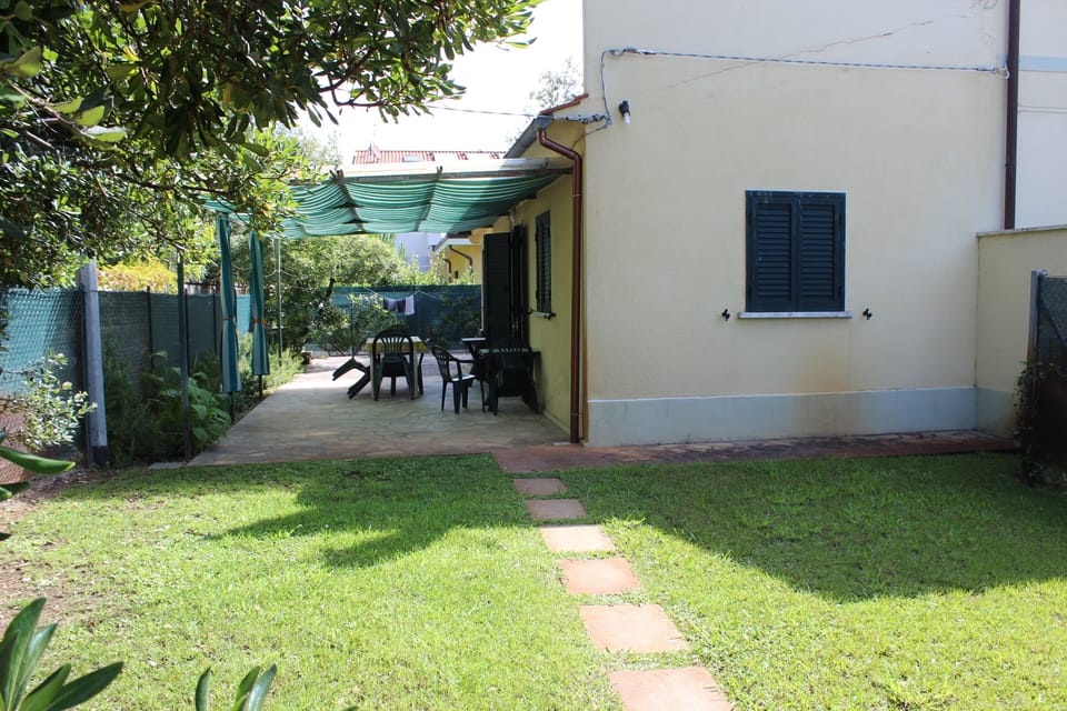 Covered patio for lunch and dinner, equipped garden (deck chairs, tables, BBQ), 2-3 parking spaces.