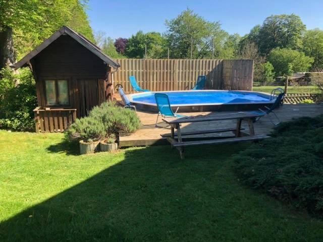 Yes, a swimming pool is available for use at La Maison du Bonheur. Enjoy the water!