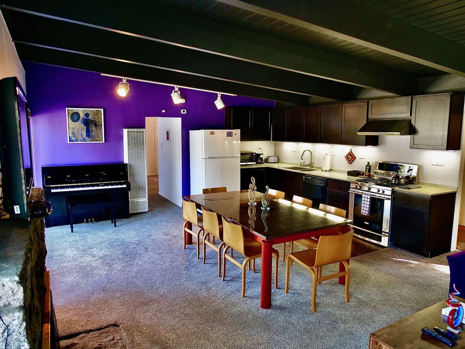 Rock out on the guitar or piano and explore the vinyl collection. The single-level home features an open living/dining area with a rock fireplace and beamed ceiling. The updated kitchen has granite countertops and all essentials. Two mini-split air conditioning/heating units provide year-round comfort.