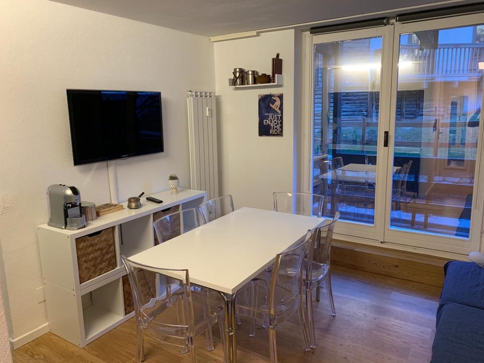 This is a ski in place. It sits on the slopes above Cervinia and has a parking space. It is, warm and really well equipped. For 4 peoole or a family of two adults and 3 children it is a great shout with 2 bedrooms and 2 bathrooms. Support for getting in was very good. There is a restaurant in the hotel next door and another a short walk away. Good views.