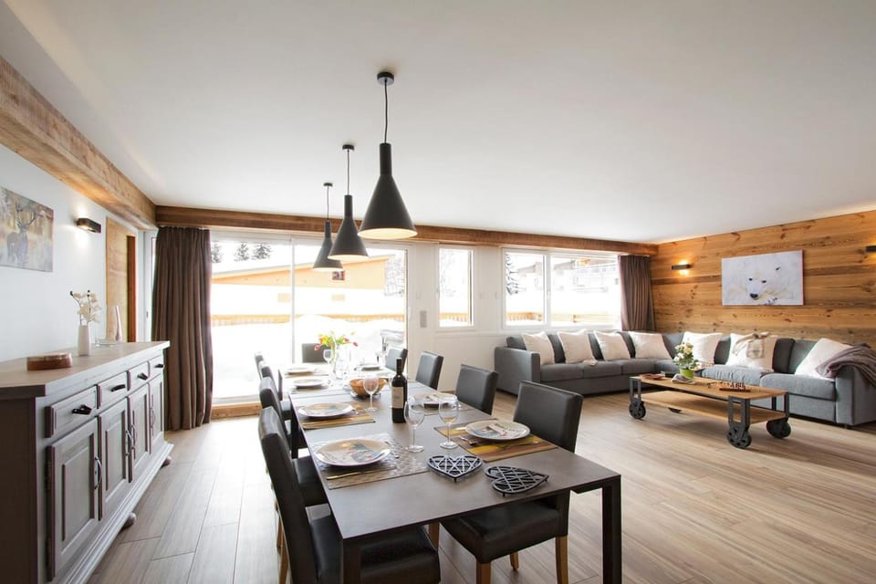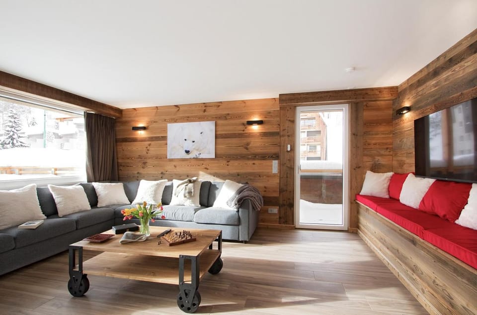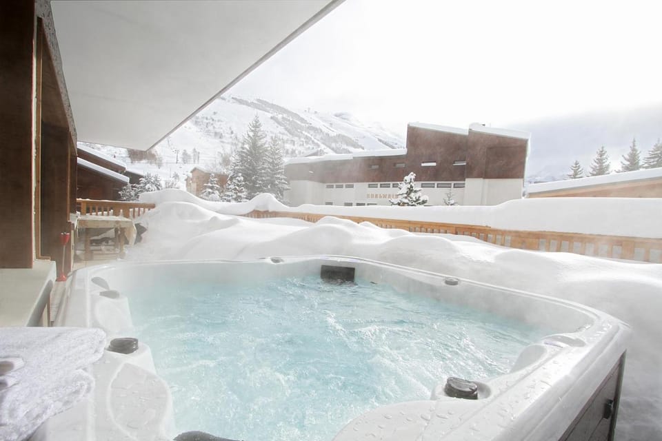 Really comfortable accommodation in a perfect location near Belle Etoile lifts. Very central for shops, bars and restaurants too. Very well equipped for catering. Had pretty much everything you’d want. Hot tub on the balcony and our own boot room with sauna downstairs.