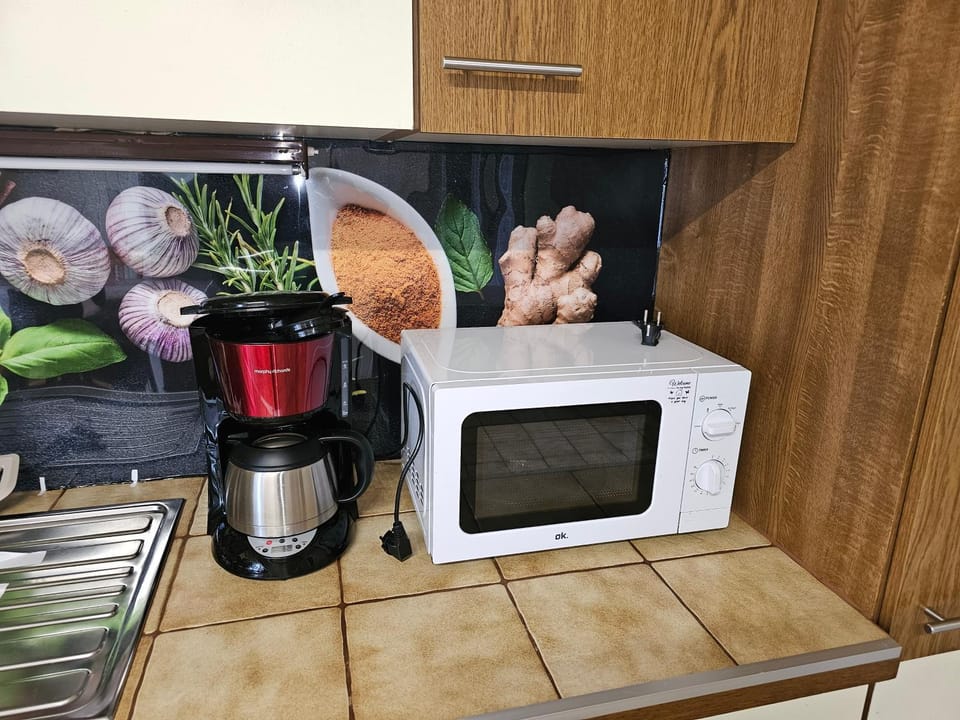 Die Küche ist voll ausgestattet, könnte aber mach höherwertiges Material gebrauchen. Bei den Schüsseln hatten wir angst sie beim anfassen kaputt zu machen. Da es so ein billiges Material war. Gewürze für den alltäglichen Gebrauch waren sogar auch vorhanden.