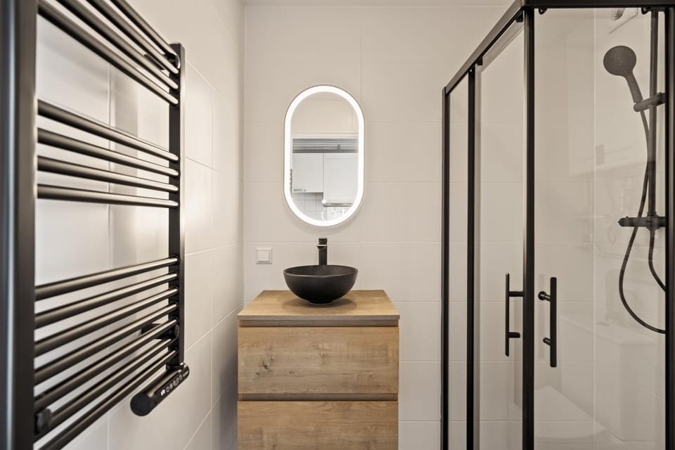 - Das Bad sieht renoviert und modern aus