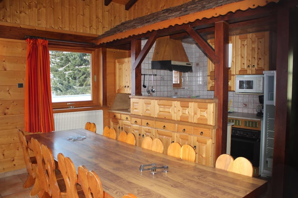 "a lovely L big chalet just a few minutes walk from the shops and ski lifts we are a family of 7 and we were spoiled staying here it is so nice."