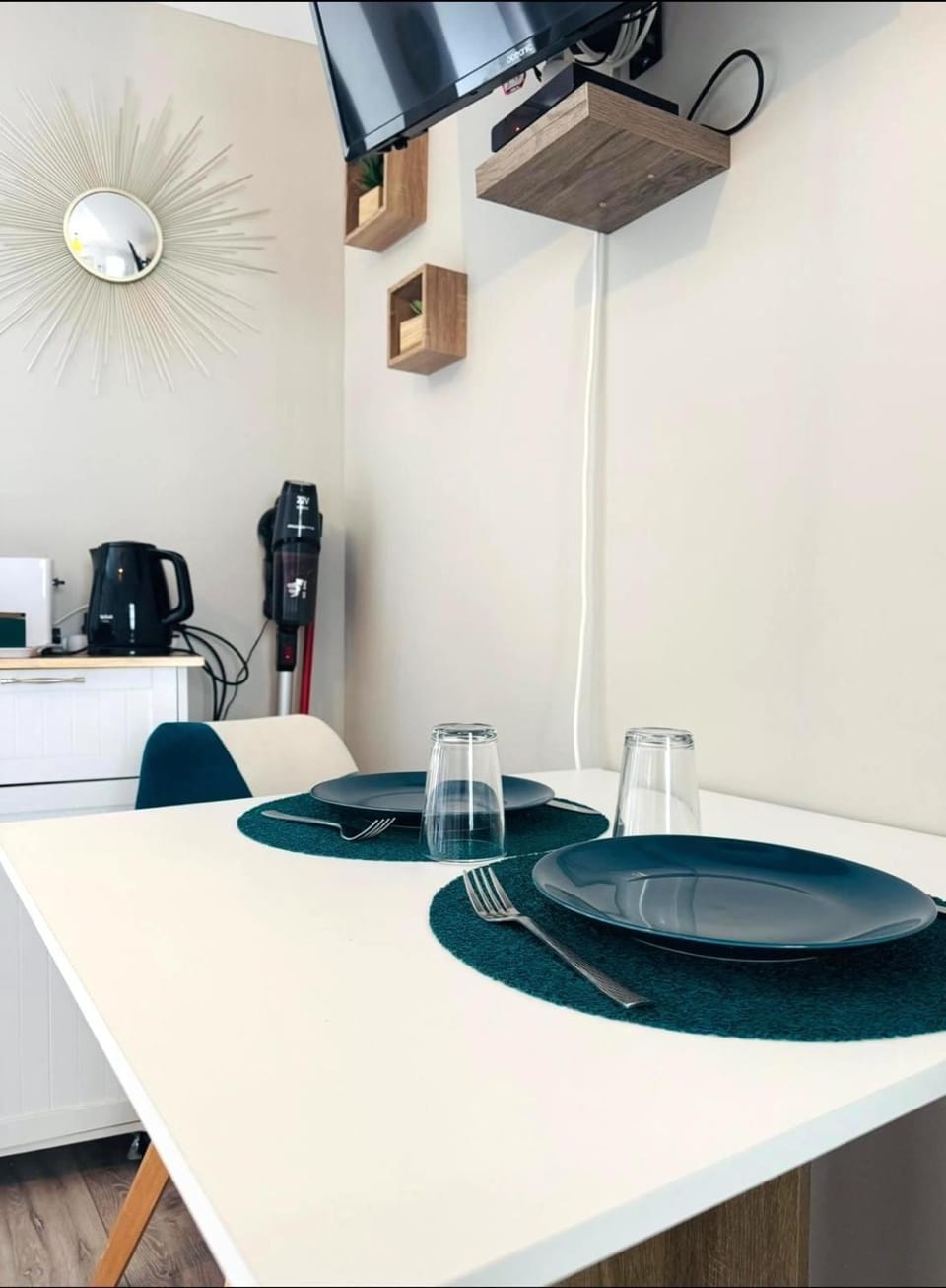 Vreem dat het appartement vol staat met schoonmaak apparatuur. Verder leuk ingericht en sanitair was goed.