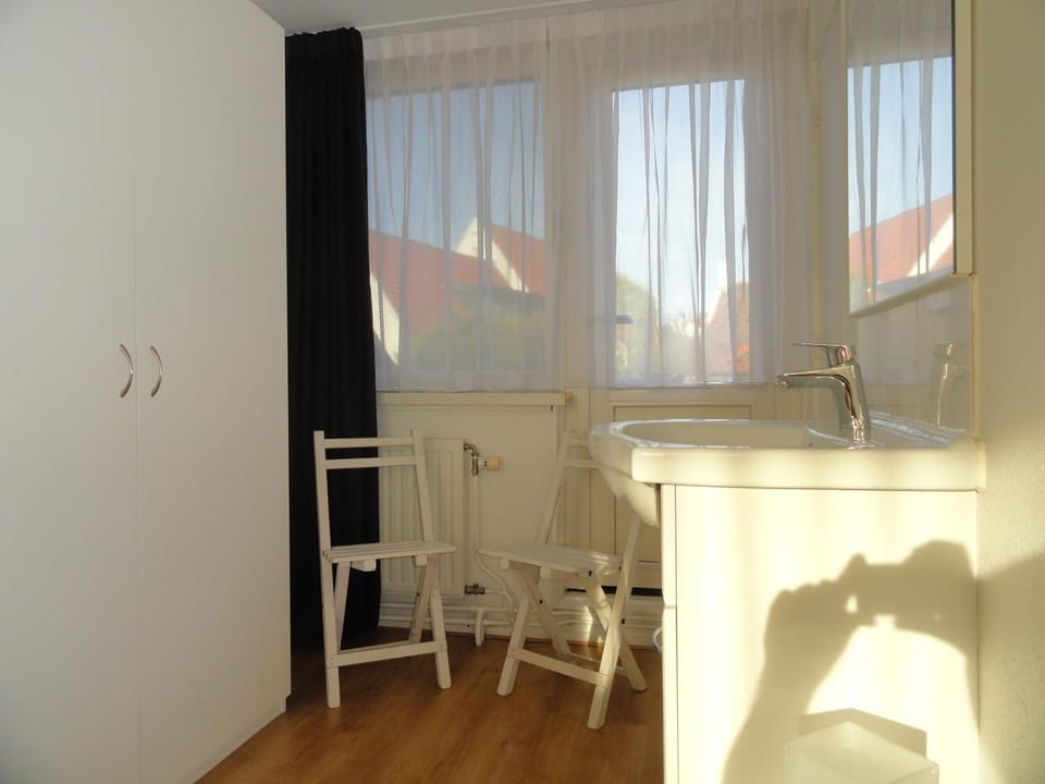 Die Betten sind jeweils etwa 70cm breit und stehen wegen der Heizkörper mitten im Raum. Deshalb ist das Lesen im Bett uns nicht möglich gewesen, denn anlehnen konnten wir uns nicht.