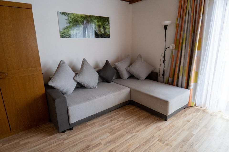 Das Schlafzimmer hat uns ganz ehrlich erschreckt. Ein Doppelbett und zwei Einzelbetten aus den 70ern. Viel zu viele Betten für einen Raum. Benjamin hat uns angemerkt, dass uns das gar nicht gefallen hat und schnell entschlossen ein Bett hoch geklappt. So hatten wir mehr Platz zwischen den Betten.
