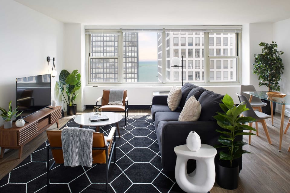 Stunning 1,200 square foot top-floor corner penthouse with oversize windows, an open layout, and dramatic city and lake views in multiple directions. This bright and modern two bedroom, one bathroom apartment is perfect for travelers looking for a stylish escape in the sky in downtown Chicago just off the Magnificent Mile and the lakefront. The building has great amenities including an amazing rooftop terrace with 360 degree views of the skyline and the lake. This is the best location in the city!