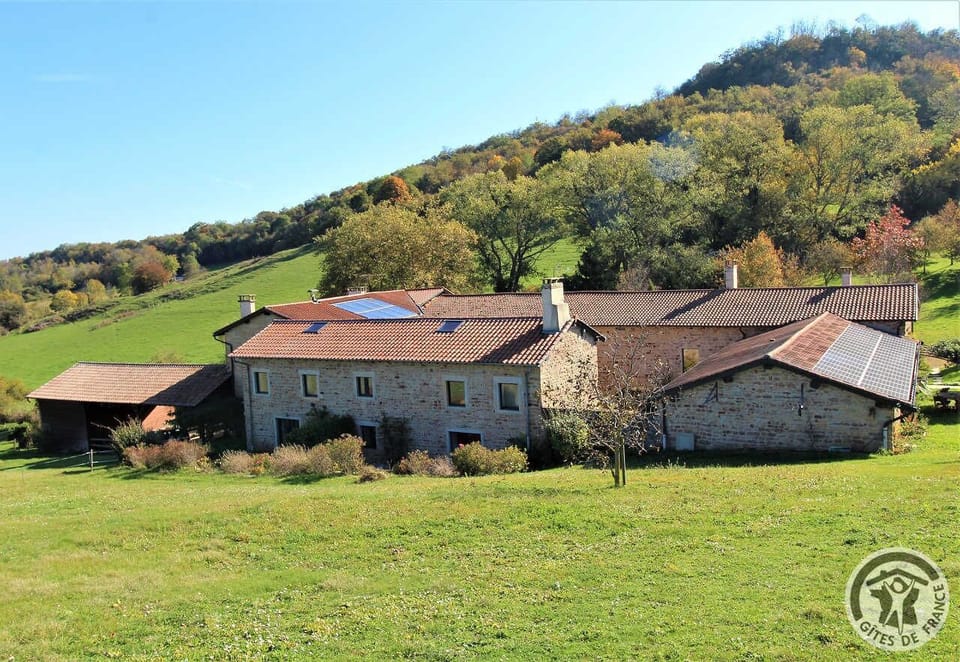 Exceptional countryside setting, at heart of the Monts d'Or protected area, less than 15 km from LYON downtown & 3 km from all shops. Splendid restored farmhouse from the 17th cent., built of golden stone, also including a 2nd adjoining gite, 1 dwelling & the owners' second home. Eco-friendly features, renewable energy sources (solar powered water heater). Ground floor: living room, kitchen. Upstairs: 2 bedrooms (double bed) (2 single beds), WC, bathroom. Attic (2 single beds). Card-operated mobile phone. Central heating (+40€/week from Mid-October to late April), outside room with shared tumble drier. Terrace, garden furniture, BBQ, sunbeds, many shared open spaces. Charge for pet: 15€/day. Exceptional countryside setting, at heart of the Monts d'Or protected area, less than 15 km from LYON downtown & 3 km from all shops. Splendid restored farmhouse from the 17th cent., built of golden stone, also including a 2nd adjoining gite, 1 dwelling & the owners' second home. Eco-friendly features, renewable energy sources (solar powered water heater). Ground floor: living room, kitchen. Upstairs: 2 bedrooms (double bed) (2 single beds), WC, bathroom. Attic (2 single beds). Card-operated mobile phone. Central heating (+40€/week from Mid-October to late April), outside room with shared tumble drier. Terrace, garden furniture, BBQ, sunbeds, many shared open spaces. Charge for pet: 15€/day.