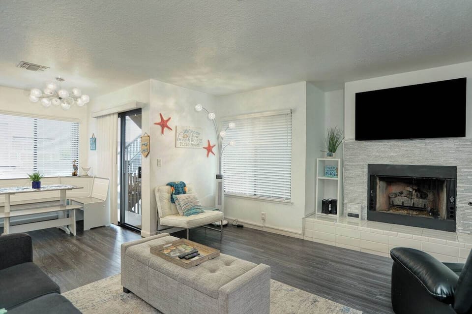 A TRUE GEM and located in the heart of downtown Pismo Beach, this modern 2 story condo is fully furnished and has everything you need for your paradise getaway. As you enter the property on the main floor you will find the living room kitchen & half bath. The living room features a fireplace and there is an outdoor patio off of the dining room. Upstairs are the two ensuite bedrooms with queen size beds with the master boasting a fireplace and outdoor patio. The building is secured with gated parking. There are stairs from the garage to the unit. Roku TV & WiFi included. You will find a variety of restaurants, entertainment, wine tasting & shops all within walking distance. No Elevator/No Smoking/No BBQ/No Pets/No Parties
