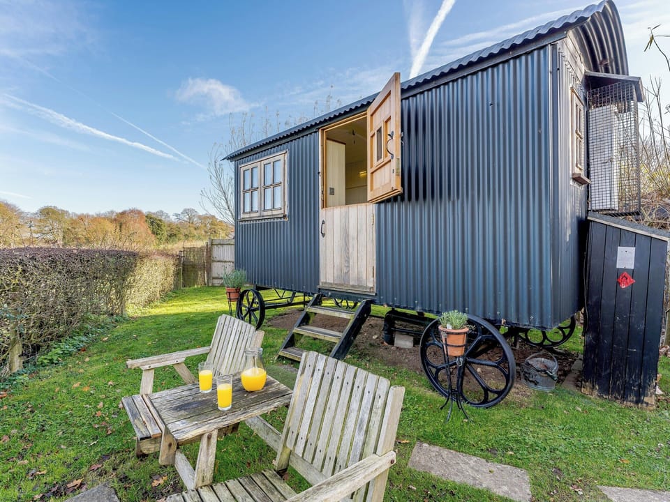 Bedroom: Double (4ft 6in) Bed, (No TV). Solar powered lighting, bed linen, towels and Wi-Fi included. Initial logs for the wood burner and firepit are included. External kitchenette with camping gas stove and wooden floor, sink and cool box. Enclosed lawned garden with sitting-out area, garden furniture, barbecue and firepit. Private parking for 2 cars. No smoking.. Elsie’s Hut is a traditional style, bespoke Plankbridge shepherd’s hut, made to a very good standard with a very contemporary feel. It is warm and cosy with its solid English oak floor, Farrow Ball painted interior and Hobbit log wood burner. The hut has a spacious shower room with toilet, Belfast sink and storage cupboards, double window and stable door. It is lit by solar power and has two 12V charging points for mobile phone or iPad and Wi-Fi. Outside there is an undercover cooking area with sink, camping stove, barbecue and fire pit and a private garden area with table and chairs for outside dining. All cooking and dining equipment is provided. Sit up on the comfy double bed or stand by the stable door to see views across the fields or watch the sunset. Enjoy the magic of stargazing with a dark sky.