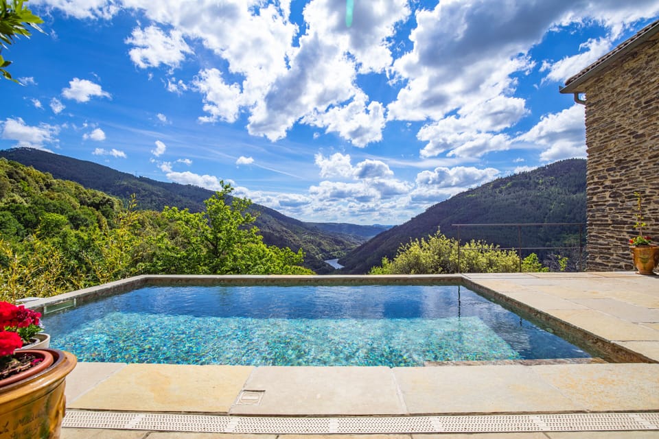 In a fully protected and natural environment, our fully renovated stone house and its swimming pool terrace enable a stunning view on the Chassezac river and the surrounding mountains. The house surface is 168 m², equipped with 3 rooms with 2-persons beds and a 4th one with two 2-persons beds, enabling to accomodate 8 to 10 persons. A large terrace opens on a 3,550 m² garden with trees. The swimming pool is protected and heated at pre-season (April-May) and postseason (Sept-Oct). Peak season booking from Sunday to Sunday.