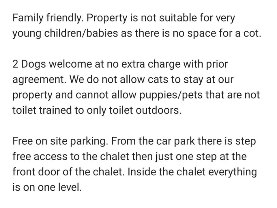 Quiet chalet site and well maintained. Good parking available. Easy access to Cromer town and surrounding area. Near a quiet part of Cromer beach via path and steps. Good hot water heater and easy to add credit to meter. Useful manual with details of things to do in area. Property although very dated (as described on advert), was clean and communication with host very excellent.