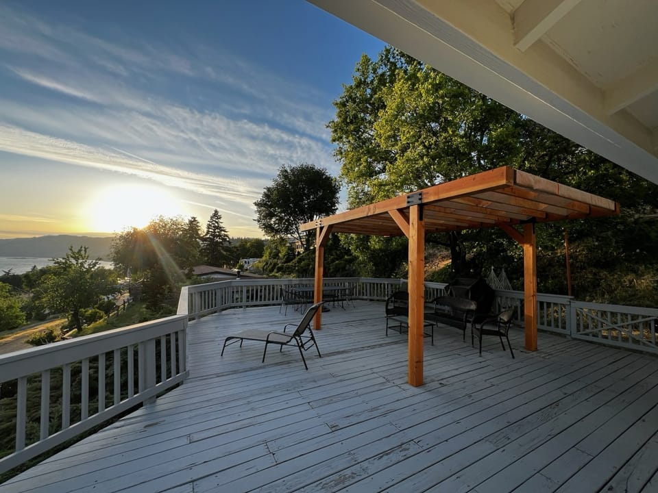 The primary bedroom offers a queen-size bed, newly renovated private bathroom, and deck overlooking the Columbia River. Another newly renovated bathroom is down the hall, along with a queen-size bedroom and a third bedroom perfect for kids with a full-twin bunk bed.