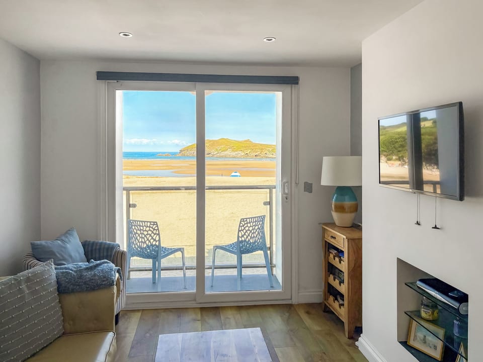 Separate Toilet.. Electric central heating, electricity, bed linen, towels and Wi-Fi included. Front garden with sitting out area and garden furniture. 2 dogs welcome, to be kept on a lead at all times. Private parking for 1 car. No smoking.. Pennti Treth is one of a trio of apartments within the superbly presented Quarterdeck, nestling adjacent to Porth Beach, a stunning stretch of soft golden sand, flanked by rugged rocks formations and with rockpools, inlets and caves for all ages to explore! Situated on the ground floor, your apartment offers quality styling throughout, with comfort leading the way. From the living space, doors lead onto your very own intimate balcony, with table and chairs where you can sit and soak up the atmosphere and panoramic views of the bay before you. There is a deep sofa and chairs and wall mounted TV, providing a great area to relax in. The kitchen/diner has a table and chairs for four guests and is well equipped and spacious. Wi-Fi is provided throughout. There are two double bedrooms, both with wall mounted TV, both with uplifting, chic décor, and plenty of storage space for your stay. You will also have your own dedicated parking space on site and shared use of an electric car charging point.