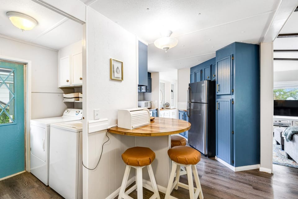 I love the view and privacy. It was really quiet in the winter season (first week of January) - cold and rainy, but perfect for my personal quiet getaway/writing retreat. You can hear the cars on the main road passing by at all hours, but it didn't bother me. I liked how many towels there were available and the decor of the home made it feel like a "home". I really liked the water pressure in the master bath and that the drain drained super well. It's dog friendly, yet I didn't smell any dog smells so bonus points for sure! I love that they gave new paper towels and sponge (cut up in half - so clever).