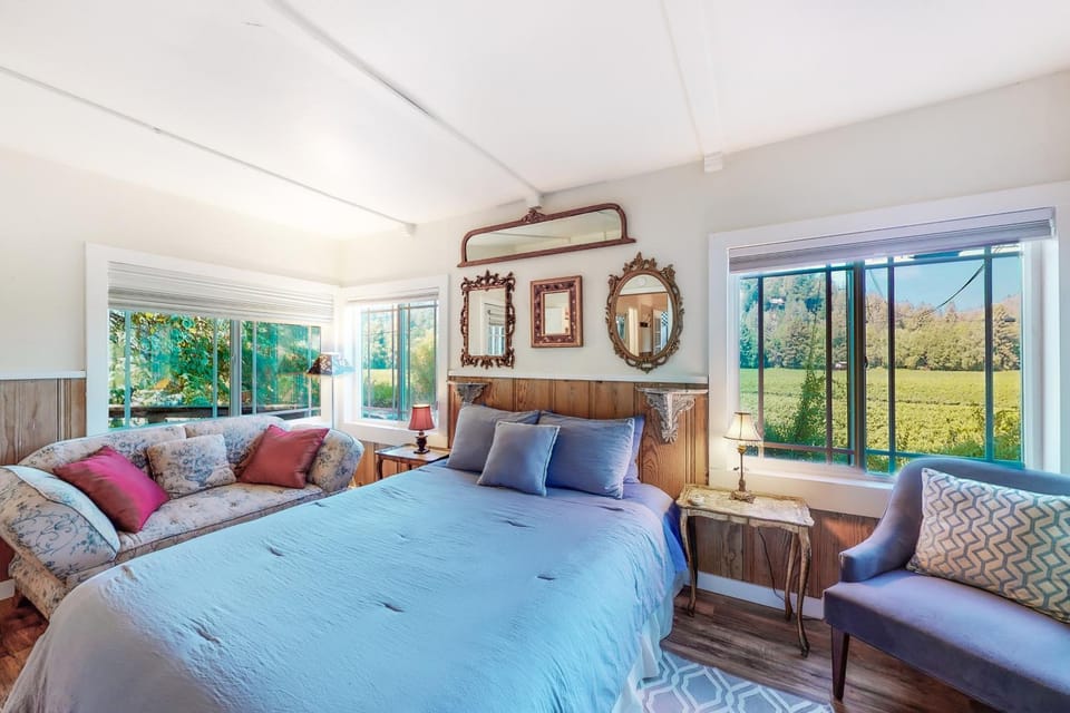 The quirky and comfortable cottage overlooks the Korbel vineyard and is located in a quiet neighborhood. The kitchen is well-stocked, and the furnishings are comfortable. The hot tub is nice to get into in the cooler evening. If you're traveling with other people, make sure you know them well since you'll be sharing the Jack-and-Jill bathroom, and the bedrooms are directly connected with each other too.