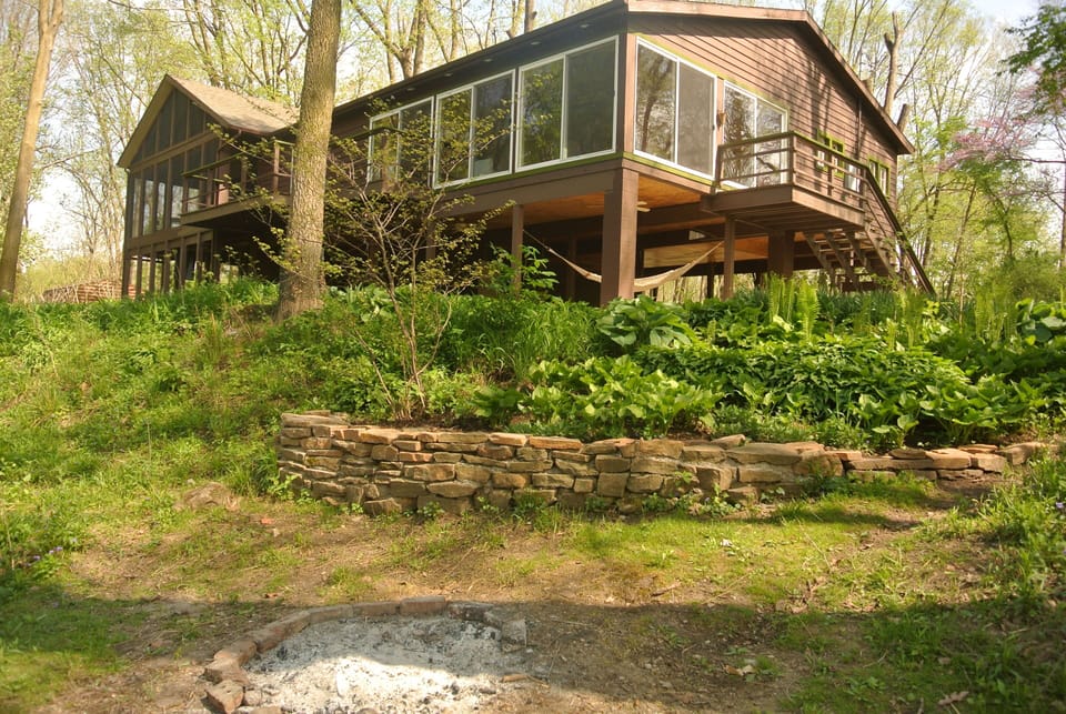Perched on the bank of the Tippecanoe River, this house hangs in air like a treehouse, giving optimal river views. The house and river offer leisure and vigorous activities: There's a prolific flowering garden, a screened in porch, outdoor patios, swings, tubing, chair surfing(river lounging), fishing, hiking, bird watching, games, bon fires, nature walks to mention a few. Come be in the wild. A river resident and unmissed neighbor, the great blue heron, unknowingly catches the attention of a room, even if only flying by. A walk to one of the islands, or across the river, is always a fun, and sometimes tricky activity. The Tippecanoe River stands two and a half feet tall at normal height. There is a mile loop that takes you through the neighborhood, for those walkers and runners.