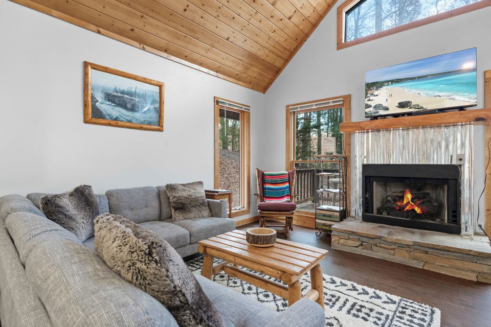 This 2 level, 2 bedrooms, 2-bathroom cabin sleeping up to 6 people is perfectly designed for your family in mind. The main floor has an open living area equipped with the living room featuring the beautiful sectional sofa, a gas fireplace, Flat screen tv and the family dining area. Enjoy the fully stocked kitchen with stainless steel appliances while the family gathers in the living room with a movie. Tucked away behind the kitchen is the main floor bedroom with a Queen-size bed and a large flat screen tv along with the hall bathroom with a shower/tub combo.