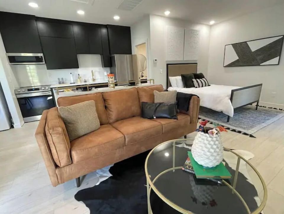 Open floor plan with kitchen, living, bedroom, office area, and bathroom