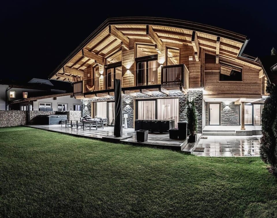 Alpine-chic 6-Bedroom Luxury Chalet in Piesendorf near Zell am See, featuring a private sauna, spa, fitness area, cinema, ski & bike garage, cozy living spaces, only minutes from cable cars of Kaprun/Kitzsteinhorn and Zell am See/Schmitten. Surrounded by snow-capped 3,000+ meter Alps, 320 m2 of interior living space, a fenced terrace and garden. Optional outdoor hot-tub whirlpool for 6 people at a fee of EUR 350, a flatrate for unlimited use during your entire stay for water, electricity and cleaning - to be paid on location at checkin.