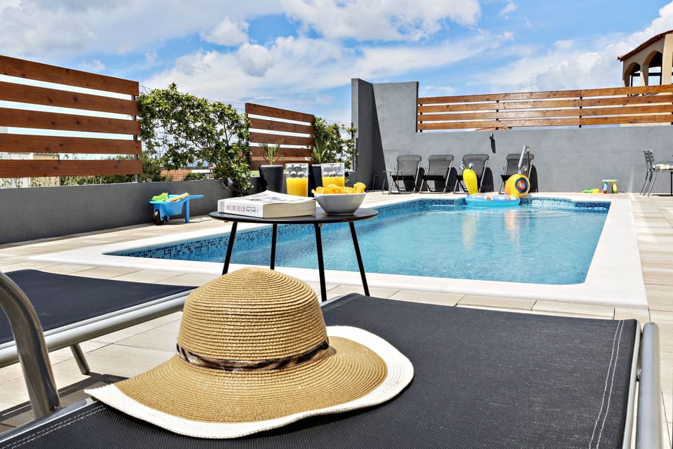 Apartment can accommodate 5 guests. Beds are situated in 2 sleeping rooms, but also in the living room, within 63m2. Guests can use a private terrace to enjoy the warm summer evenings. The apartment offers the sea view. Food can be prepared using barbecue which is shared with other guests too. Shared pool is on disposal during stay.
