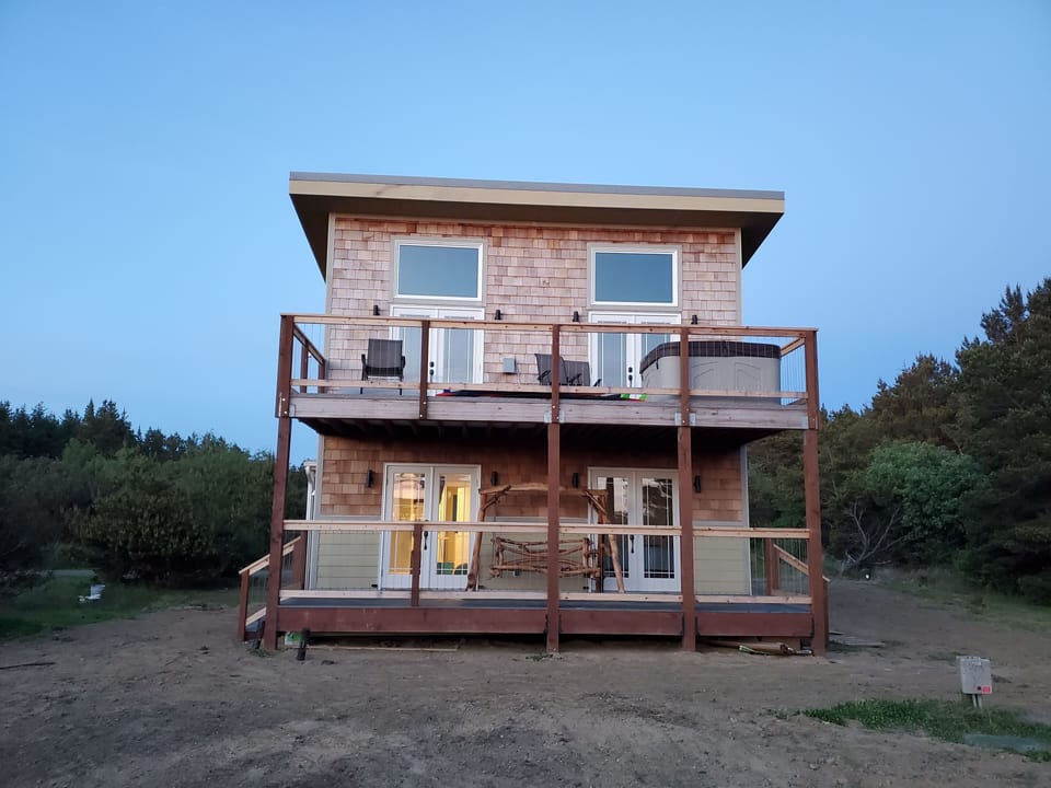 Recently custom build home in a quiet beach neighborhood. Private pathway to the beach and a view of the ocean from the hot tub. Outdoor shower, high speed internet, full kitchen upstairs, kitchenette downstairs and an outdoor fire pit. Laundry on both levels. Perfect for multigenerational families!