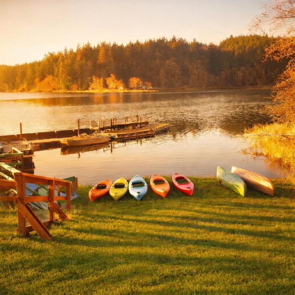 "Quiet peaceful location and unique decor that is well done. Very comfortable beds. Outdoor fire pit. Water view and access to lake"