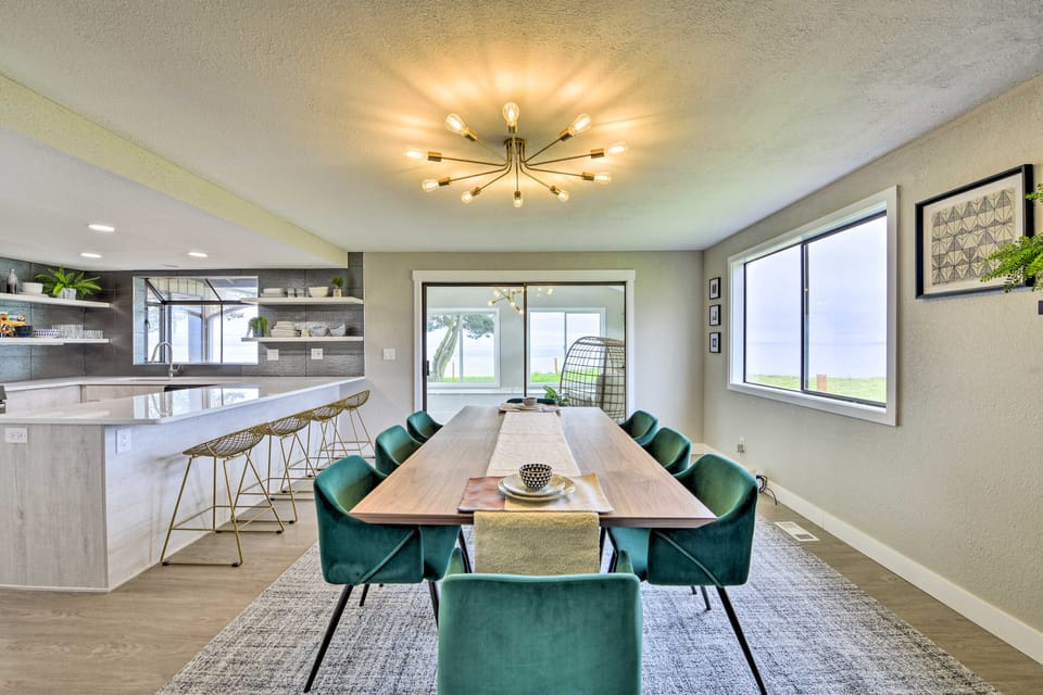 Elevate your Puget Sound getaway with a stay at this modern cliffside home, sitting only 4 miles from the heart of Oak Harbor and overlooking an awe-inspiring coastal view. The 4-bedroom, 2.5-bathroom vacation rental offers a chic, newly renovated interior that features a full kitchen, dining area, and various interior ocean views. Venture out on a day trip to the Olympic Mountains, and later, savor a glass of wine and some charcuterie by the gas fire pit, just in time for a colorful sunset!