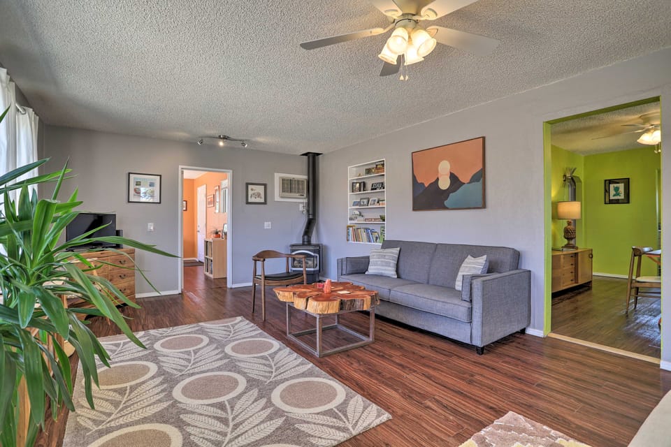 Take a break from the city and come 'home' to this retro-chic Joshua Tree vacation rental. The colorful 2-bedroom, 1-bath house is perfect for small families or couples traveling together. During the day, hike the Hidden Valley Nature Trail or take in the desert majesty from Black Lava Butte and Flat Top Mesa. Stargazers will love the view of the Milky Way at nighttime, with a blazing fire pit keeping the whole group warm in the cozy backyard. Your ideal vacation is waiting at 'Rockview House'!
