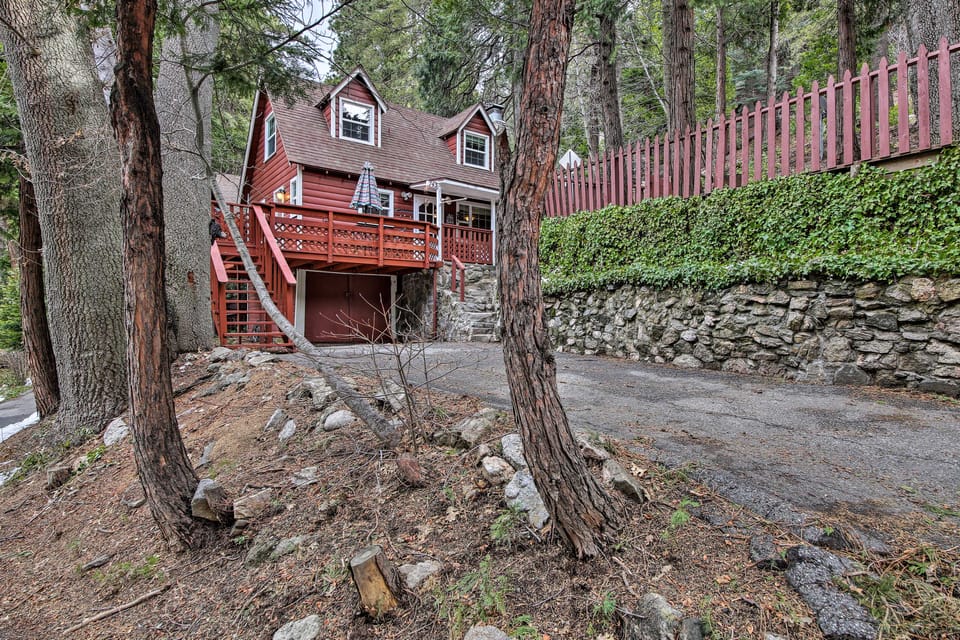 Experience peaceful mountain living at this charming 2-bedroom, 1-bath vacation rental nestled in the San Bernardino Mountains. Known as the 'Snow White's Cottage', this retreat boasts original wood beam ceilings, a wood-burning fireplace, and a wraparound deck with mountain views. Venture out to Lake Arrowhead Village and spend the day browsing local shops and galleries, or board the Arrowhead Queen for a guided tour of Lake Arrowhead. Come winter, hit the slopes at Snow Valley Mountain Resort.