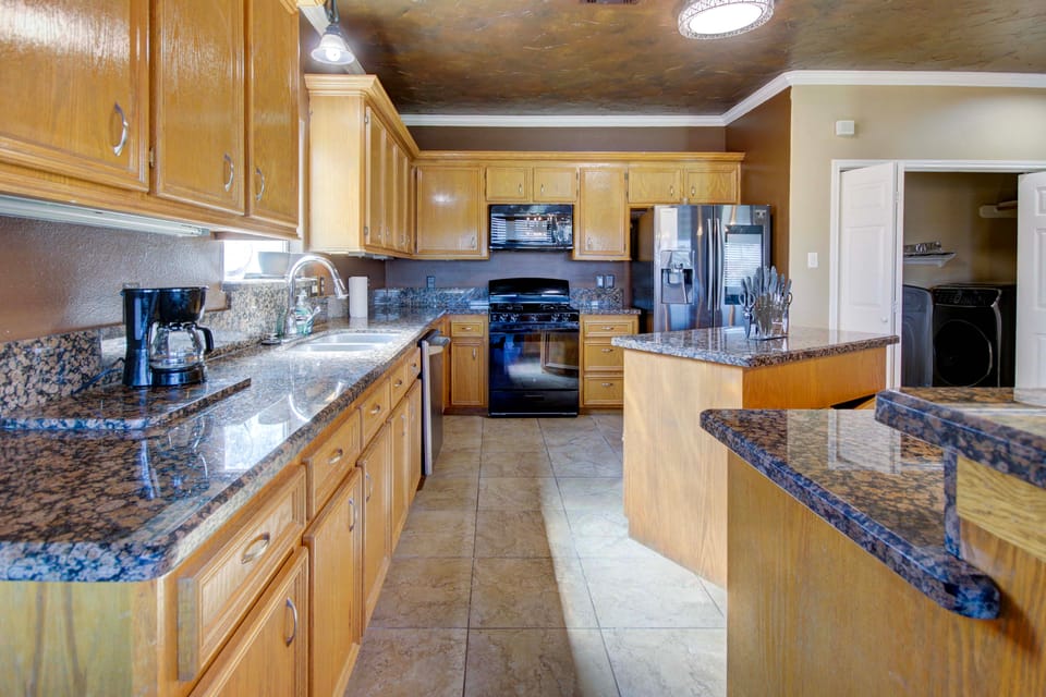 KITCHEN: Fully equipped, kitchen island, stainless steel appliances, breakfast bar, drip coffeemaker, Samsung Smart Fridge, granite countertops